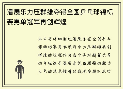 文章摘要:潘展乐的突破极限勇夺金牌,力压群雄,书写了中国体育历史新篇章。这一成就不仅展示了他个人在竞技体育领域的超凡实力,也彰显了中国体育在世界舞台上的崭新面貌。本文将从潘展乐的成长历程、训练与坚持、比赛中的表现及其历史意义四个方面,深入分析这一非凡成就。通过详细阐述,我们可以更加全面地了解潘展乐如何一步步突破自我,最终站上世界之巅,成为无可争议的金牌得主,成就中国体育新的辉煌。本文将充分挖掘潘展...