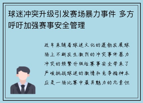 文章摘要:近年来,球迷冲突引发的暴力事件时有发生,赛后的局势往往失控,带来了严重的社会问题。在一些球迷的激情失控下,暴力事件不仅伤害了众多球迷,也影响了赛事的正常进行。本文将从四个方面进行详细阐述:首先,分析球迷冲突的原因,接着探讨赛后局势失控的表现,再讨论暴力事件对球迷和赛事的影响,最后分析如何通过有效措施预防和减少此类暴力冲突的发生。通过对这些方面的深刻分析,本文旨在引发社会对球迷行为的重视,...
